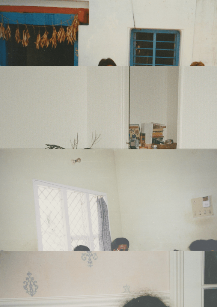 The doorways, windows and walls here span the early 90s, late 90s, early 2000s and 2020s. They span movements between the village, the city, the UK as promised land and where a family was unexpectedly made. The makings and unmakings of home with unexpected people and the unexpected consequences. The village, seen in the mango leaf garlands that are hung on doorways during auspicious occasions to ward off evil spirits, the first flat my family lived in in the city which I didn’t visit but am able to occupy by spending time with images, scanning and zooming into the textures of the walls, recognising the lightswitches and heavy dining chairs I later sat at in a different flat.